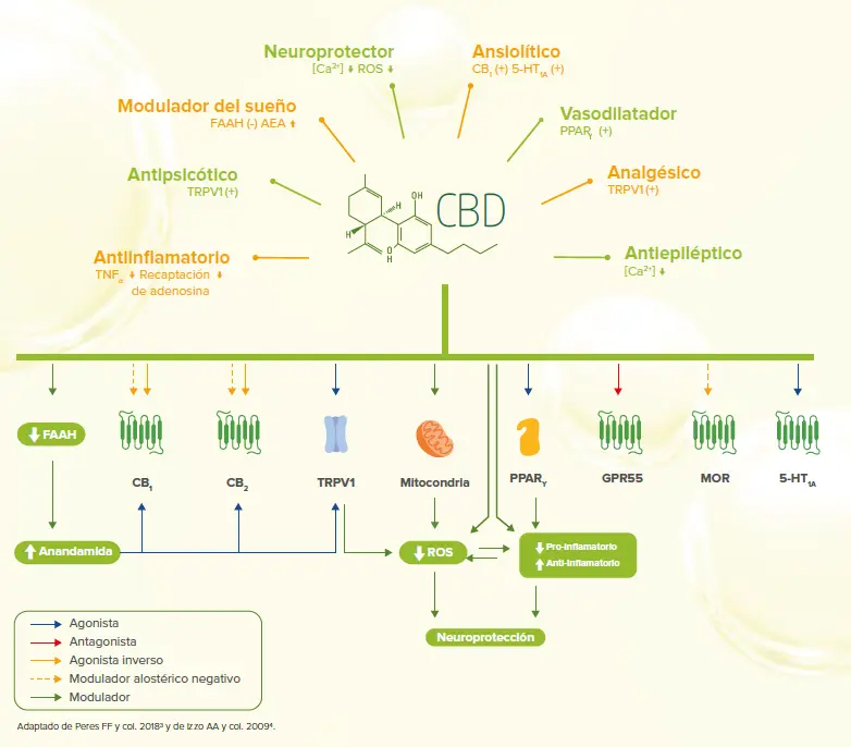 El CBD ejerce sus efectos a través de una diversidad de mecanismos moleculares, interactuando con múltiples blancos y vías de señalización en el sistema nervioso central y periférico.