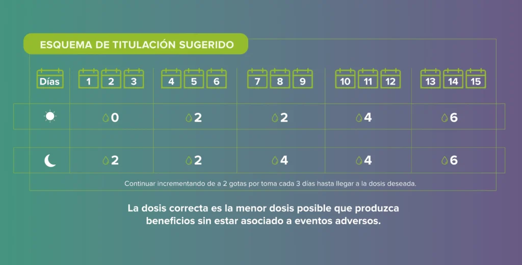Se sugiere un esquema de titulación gradual: iniciar con 10 mg (2 gotas) dos veces al día, aumentando 5-10 mg/día cada 2-3 días, hasta una dosis de 40 a 100 mg/día. La dosis correcta es la menor que produzca beneficios sin eventos adversos.